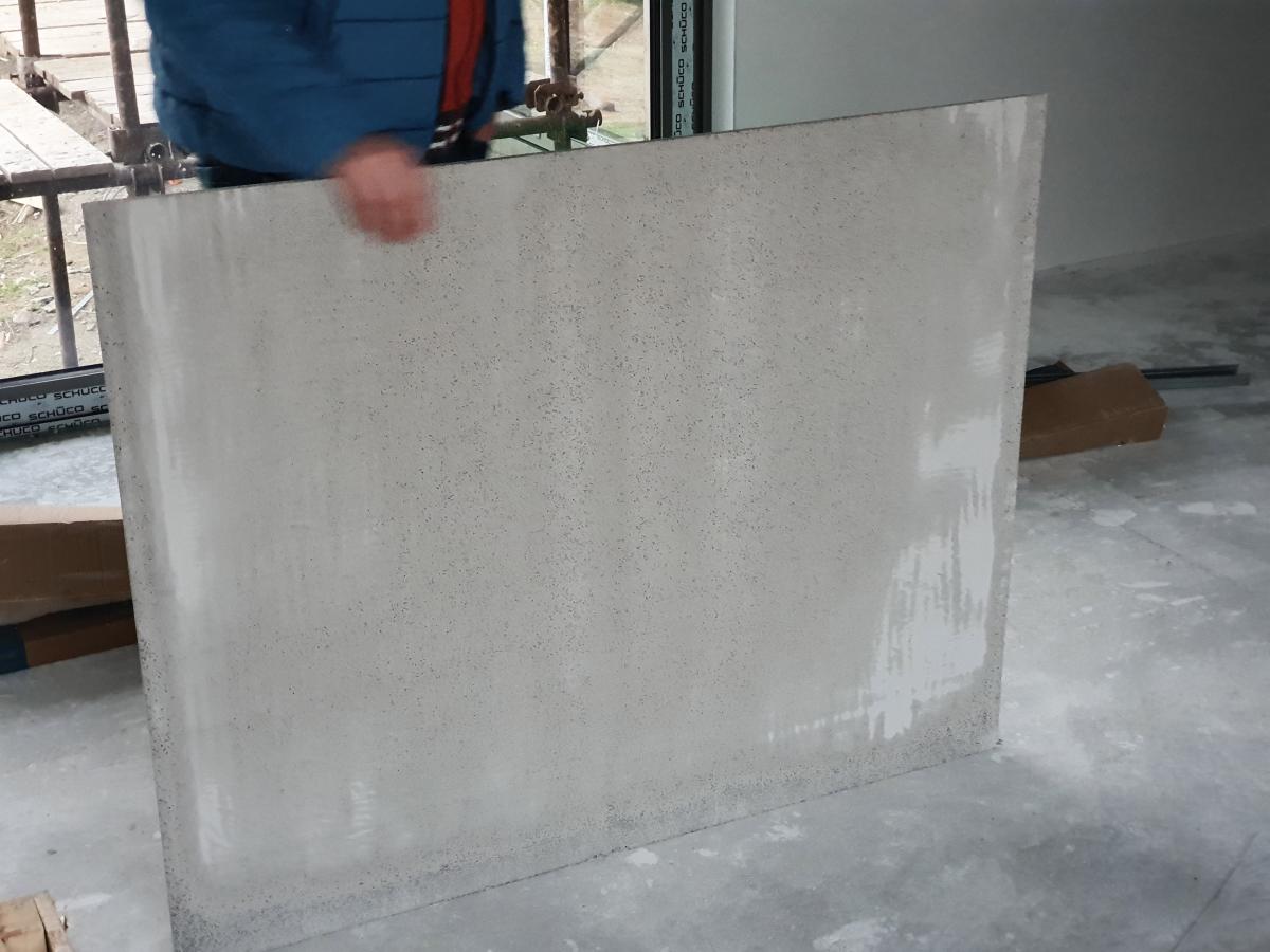 Dosky už ale boli dovezené na stavbu. Takže v tomto prípade sme sa s investormi dohodli, že dosky budeme montovať opačne a priznáme tú „škaredšiu“ nepohľadovú kvalitu, aby sme sa vyhli nápisom na doskách. Dosky sa budú montovať tak, aby sa pri montáži porozhadzovali približne rovnomerne tak, aby neboli na kope príliš prebrúsené a na iných miestach neprebrúsene. V princípe to takto dosahuje stále vzhľad betónu, ale taký „surovejší“ a investorom to nevadí. Dosky budú napenetrované priehľadným penetrákom kvôli lepšej odolnosti proti vode – hlavne zvislé časti, po ktorých môže stekať dažďová voda.