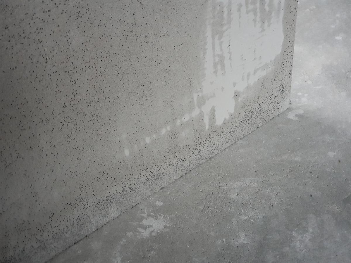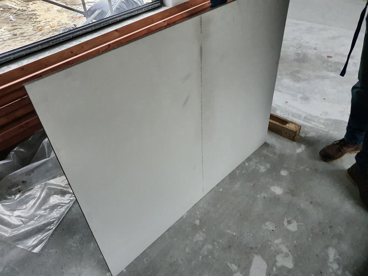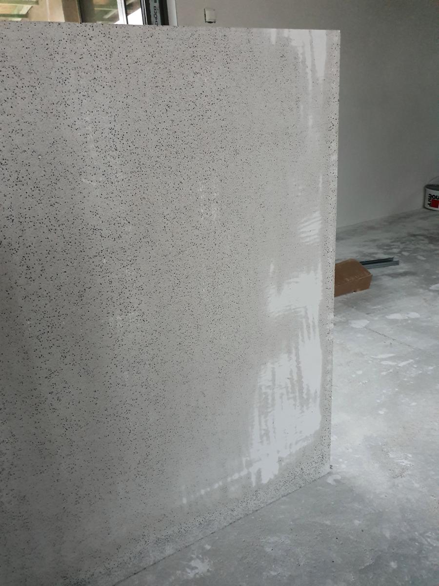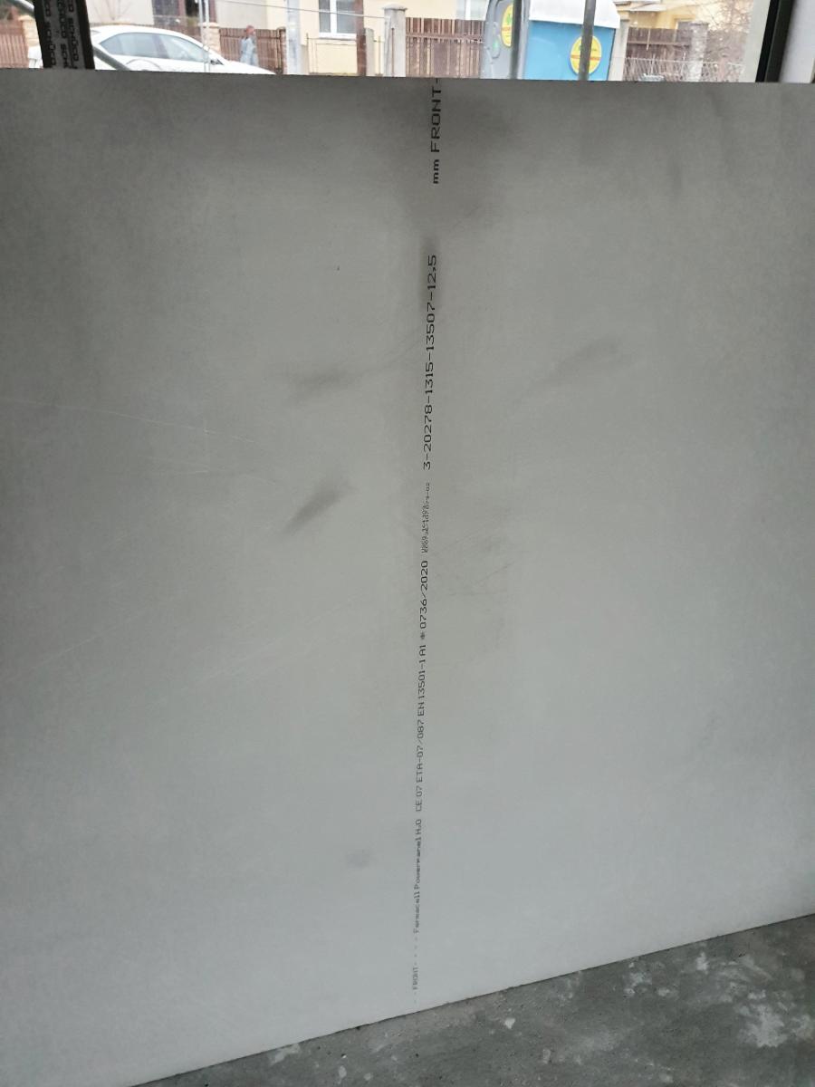 Na tento pás s popisom technický poradca Fermacellu nikoho počas konzultácií neupozornil. Ani projekciu, ani investora a ani realizačnú firmu, ktorá to tiež konzultovala. Opačné strany dosiek nie sú štandardne uvažované ako pohľadové a majú na sebe rôzne úseky prebrusovaných častí.  Pravdepodobne miesta, ktoré pri výrobe vytŕčali a treba ich zabrúsiť do roviny. Každá doska to má inak a niektoré skoro vôbec. Okrem toho je viditeľná vnútorná štruktúra materiálu dosky – čierne bodky. Viď ďalšie foto nižšie: