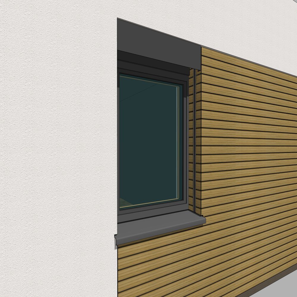 Fasáda sa realizuje iba ako hlavná „naložená plocha“ na zateplení. Nerobí sa z dreveného obkladu úprava aj v rámci ostenia. Ostenie okna je štandarde vyomietané. Detail napojenia okna na fasádu je preto jednoduchý rovnako ako pri omietanej fasáde. Ide o najjednoduchší a aj najekonomickejší spôsob riešenia drevenej fasády a preto sa často používa. Zvyčajne sa použije rovnaká farba omietky ako na dome, čo je často biela omietka. To ale potom veľmi „svieti“. My preto odporúčame ostenie spraviť z farby, ktorá je tmavšia (napríklad sivá ako je na obrázkoch, prípadne príbuzná farba k drevenému obkladu).