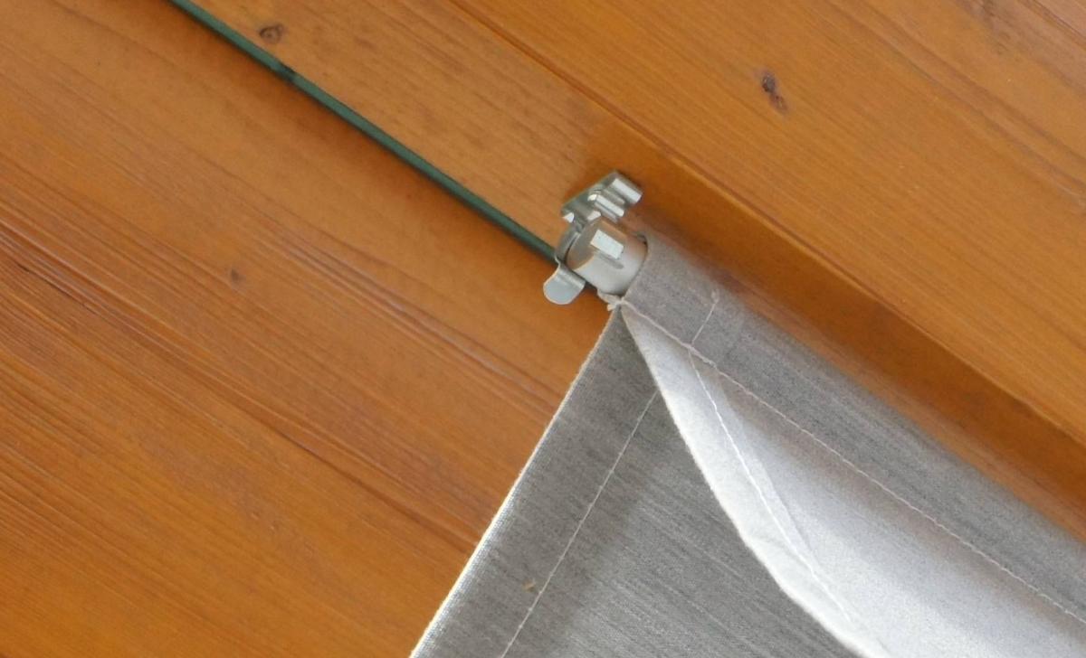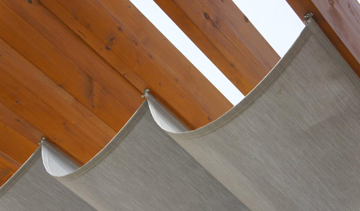 Je tu použité kalené sklo. Na leto si tam majiteľ domu dal vyrobiť jednoduché plachty, ktoré tam pred letom nacvaká na také kovové háčiky. A plachty sú navlečené do hliníkových tyčiek. Lepšie to vidno na fotkách a detialoch toho uchytenia: