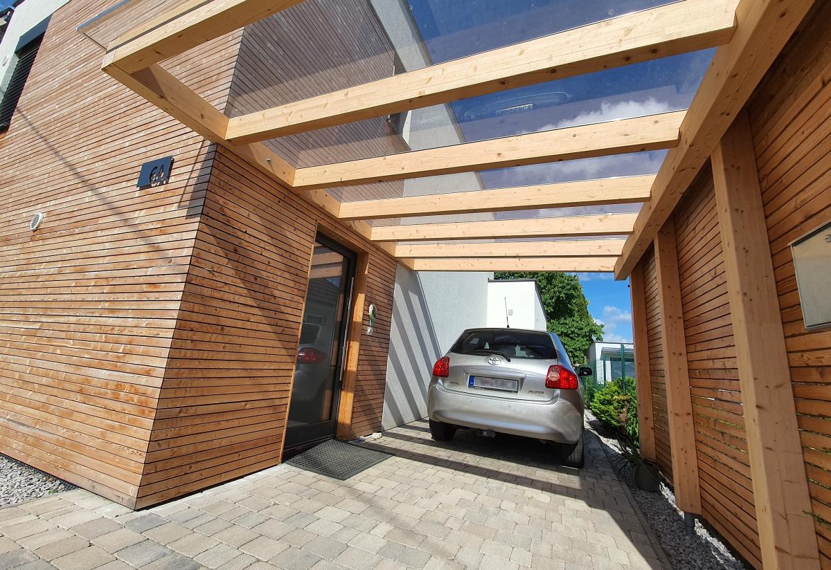 Na obrázkoch nižšie je zase ukážka prestrešenia terás a vstupu do nášho domu. Máme použitý plný polykarbonát. V našom prípade som dom navrhoval tak, aby terasa bola v lete tienená veľkou čerešňou, takže nepotrebujeme žiadne iné tienenie. Ak v budúcnosti čerešňa „dožije“ a pôjde preč, tak budem musieť tienenie doriešiť.