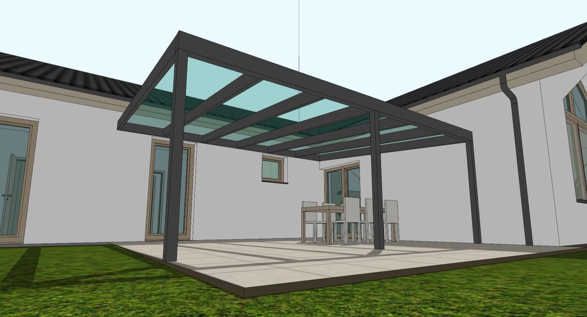 Priehľadné prestrešenia sú výborné vtedy, ak by plné prestrešenie príliš zatienilo interiér. Na prestrešenie používame buď kalené sklo, alebo plný polykarbonát hrúbky min. 8mm. Určite neodporúčame žiadny komôrkový polykarbonát, pretože tam sa vždy do komôrok po čase dostane bordel aj keď sa to poprelepuje systémovou páskou. Cenovo je sklo o niečo drahšie ako polykarbonát, ale nie sú to násobky cien. Často volíme polykarbonát práve kvoli jednoduchšej realizácii a montáži. Priamo na stavbe sa dá do neho vŕtať. Sklo sa musí vopred presne objednať aj s prípadnými otvormi, ak sa cez sklo priamo kotví.