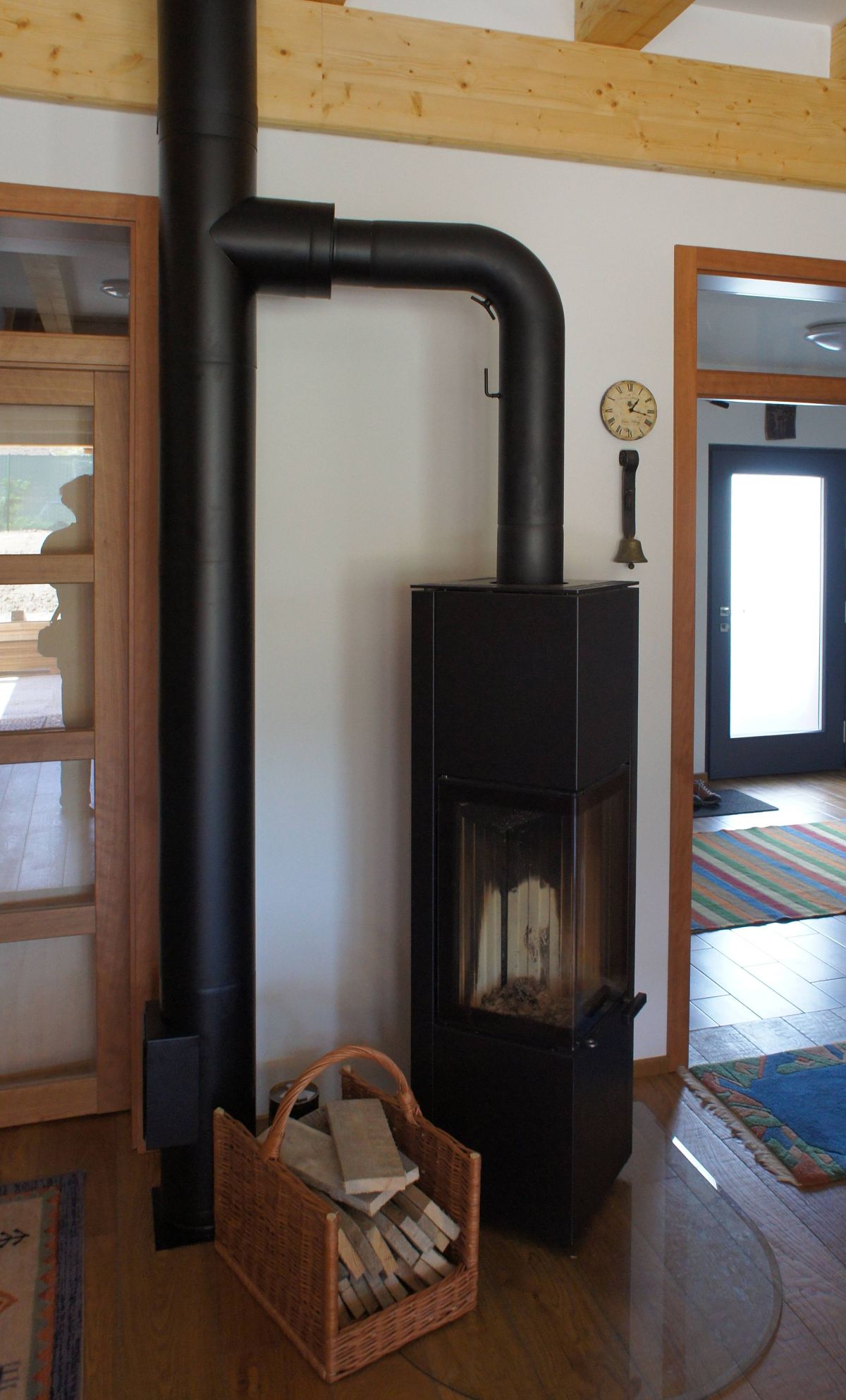 Ukážka bočného pripojenia piecky do nerezového komína z RD 321 Záhorská Bystrica. Investor to takto mal už v predošlom dome a páči sa mu takto dizajnovo, preto to chcel znova takto zrealizovať: