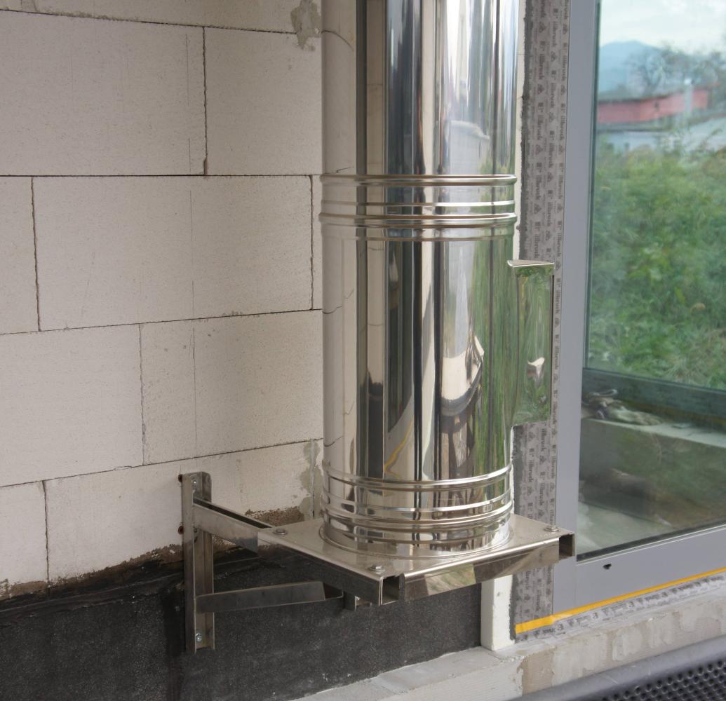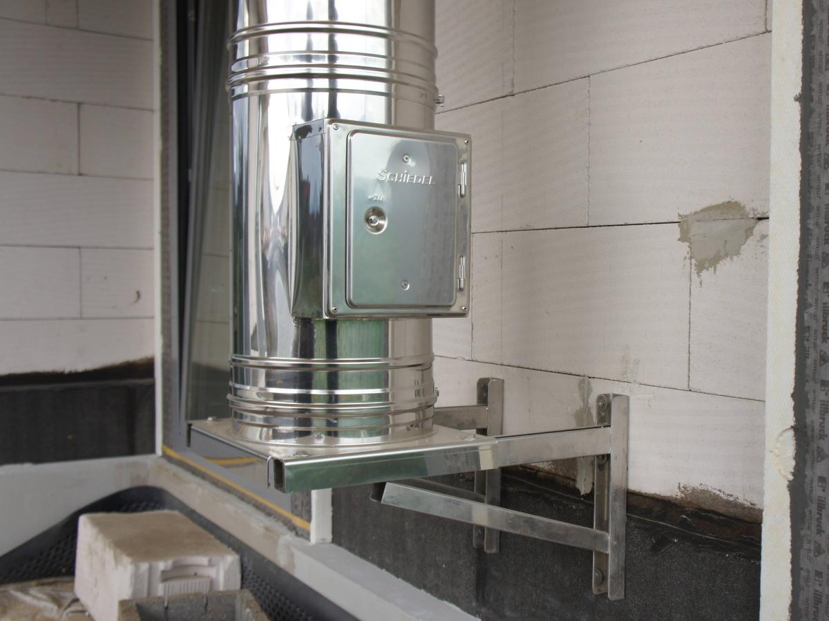 Ukážka čistiaceho kusu na nerezovom komíne v exteriéri ešte pred zateplením fasády. (Z projektu RD 171 Liptovský Mikuláš):
