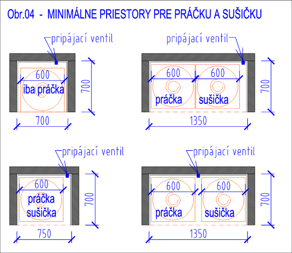 V prípade, že bude použitá práčka šírky 450mm (zhora plnená) neodporúčame niku zužovať a treba ju nechať ako pre práčku 600mm. Je to rezerva do budúcna a užší priestor sa bude aj zle obkladať, omietať a vôbec v ňom niečo realizovať.